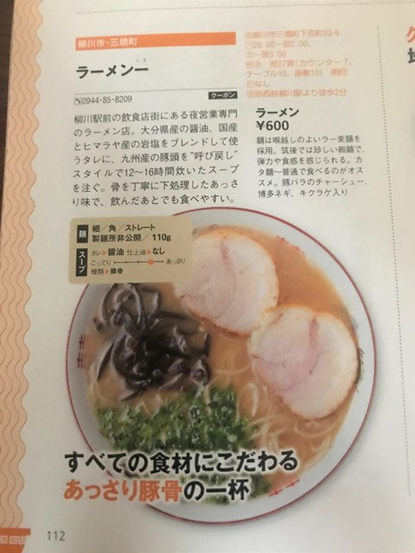 以来、自身の人生全てを“柳川ラーメン”の創造に捧げ、現在に至る。 常に現在進行形で研究を続け、進化し続けるラーメンを提供している。 妥協は一切許さない、店主ひとりで作り上げる至極の一杯は必食の逸品。