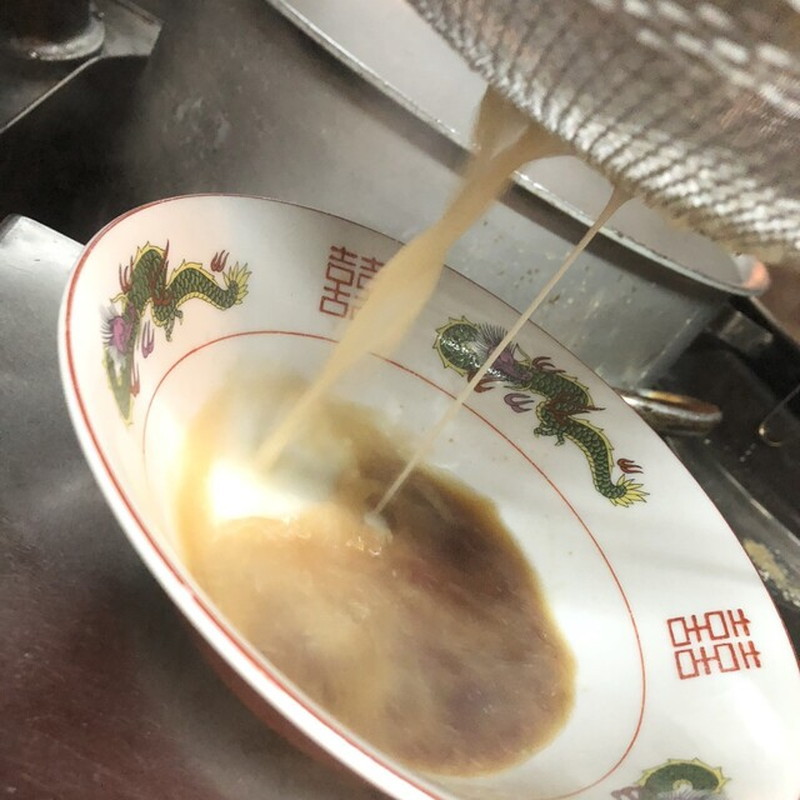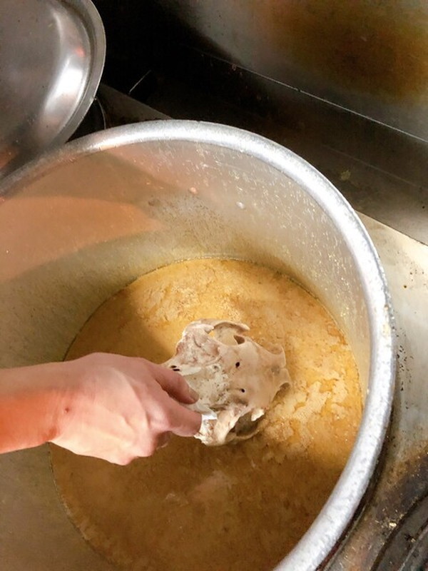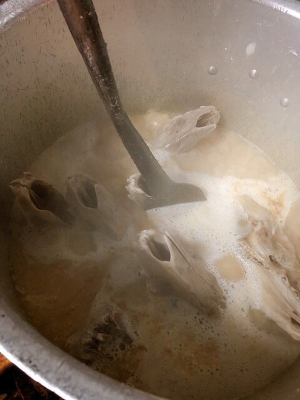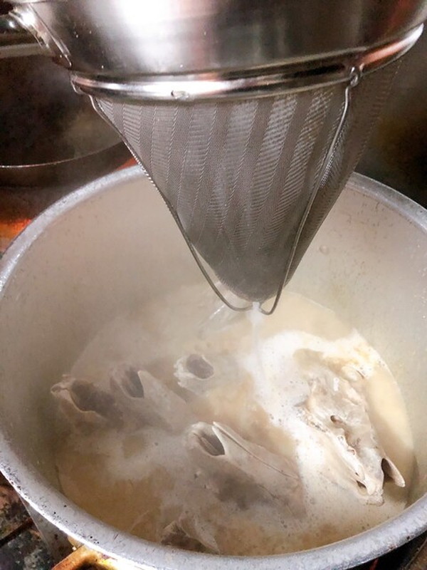 5時間丁寧にアクを取ってから強火で下処理をしてから、本寸胴に入れて炊き、コゲが付かないように20~30分に一回混ぜて、合計12時間炊いたスープは絶品!