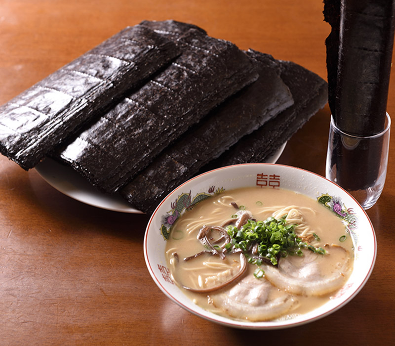 麺は福岡県産【小麦ラー麦】を使用した特注『博多系細麺』地元柳川のり。